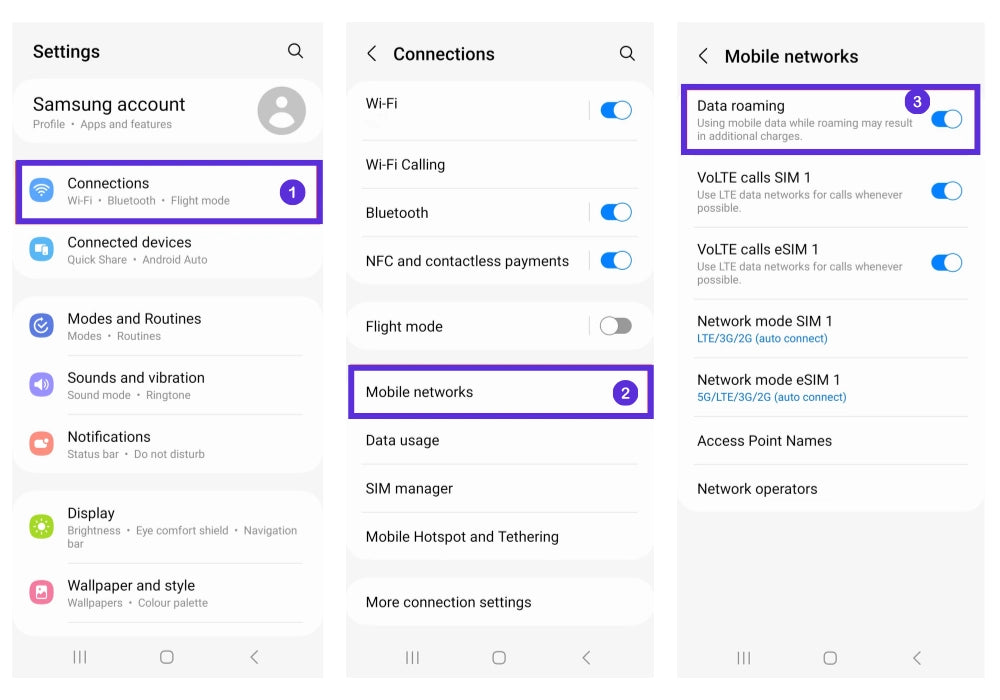 > Locate the Data roaming option and toggle it on. This will allow your device to use mobile data while roaming.